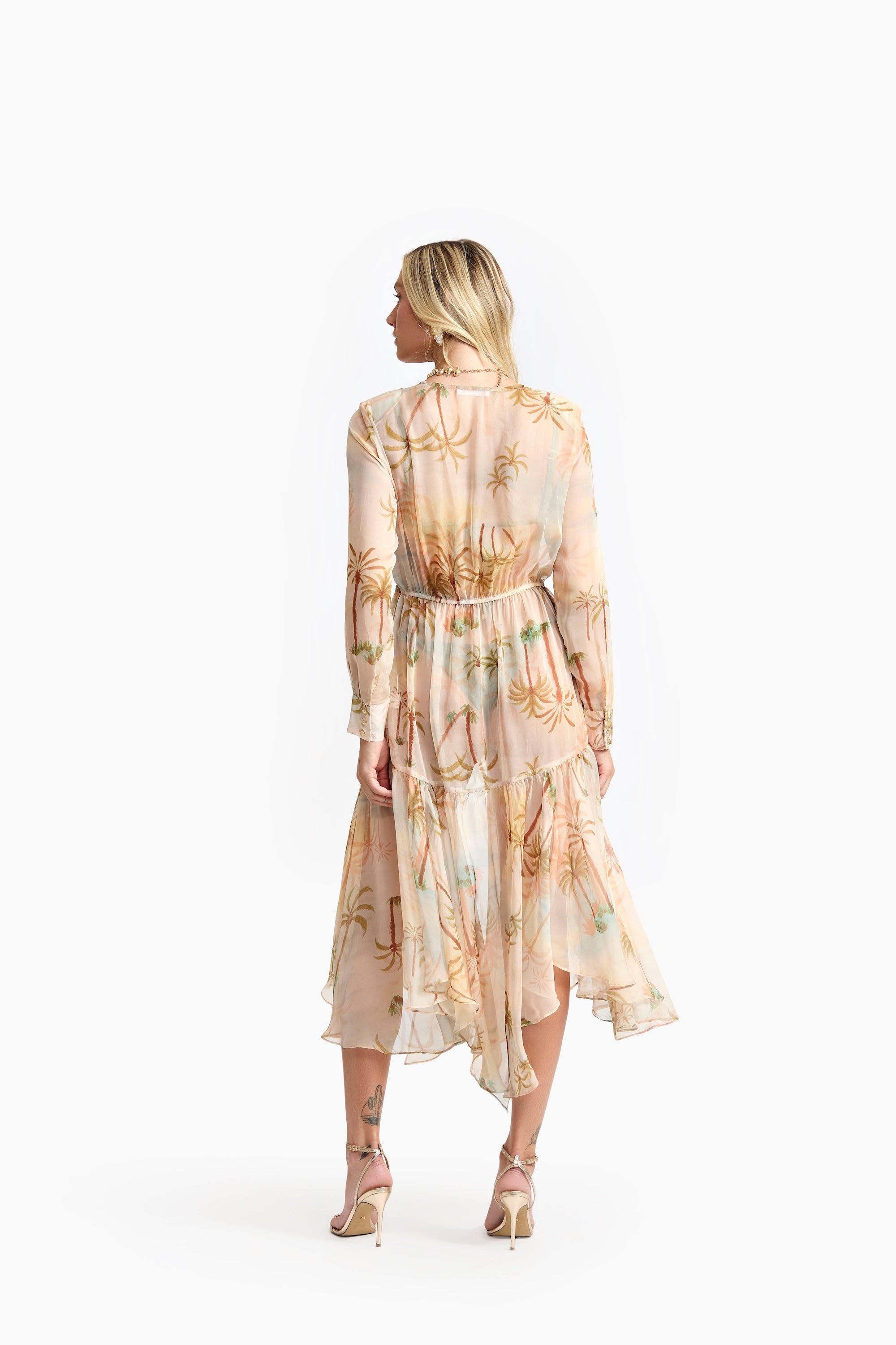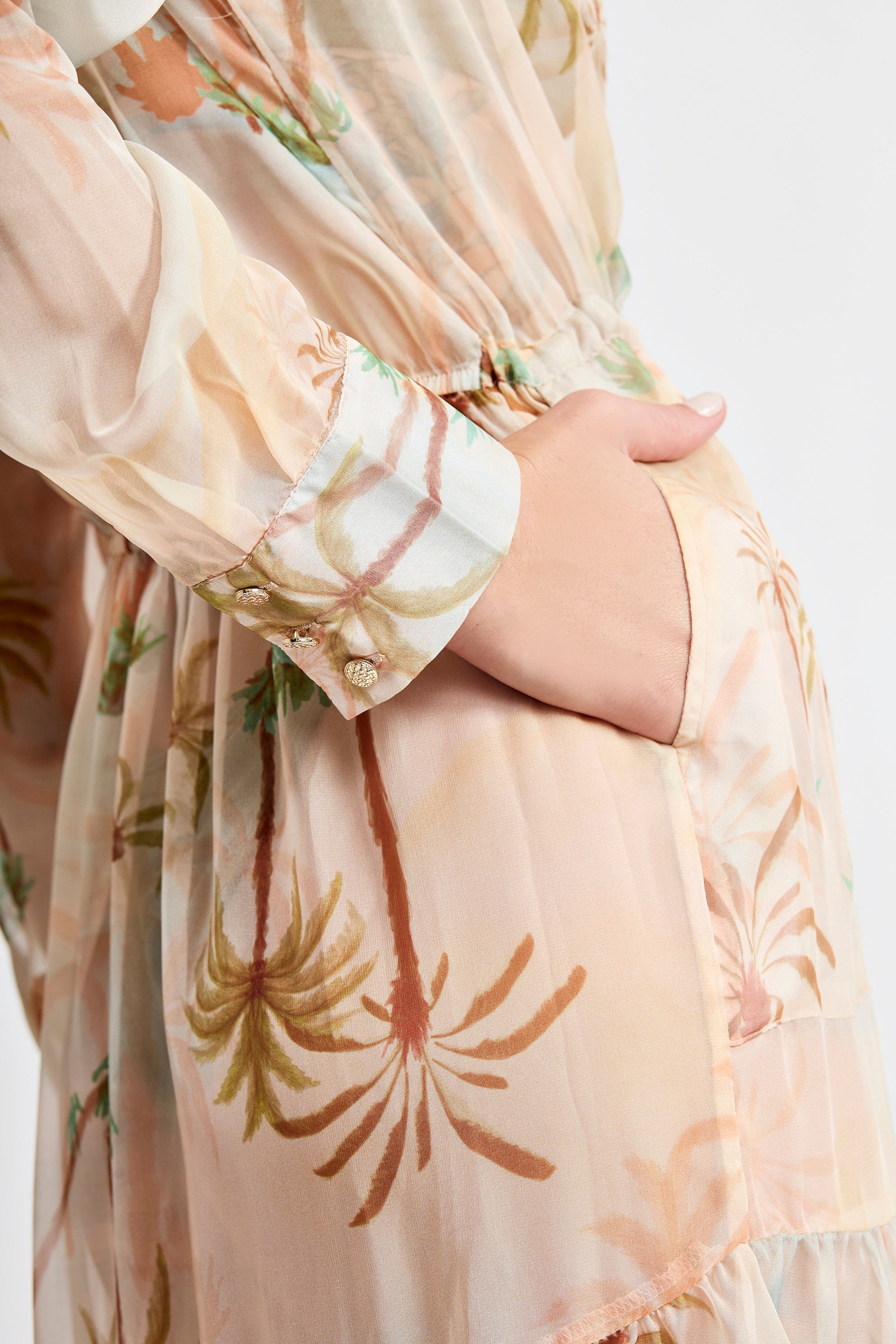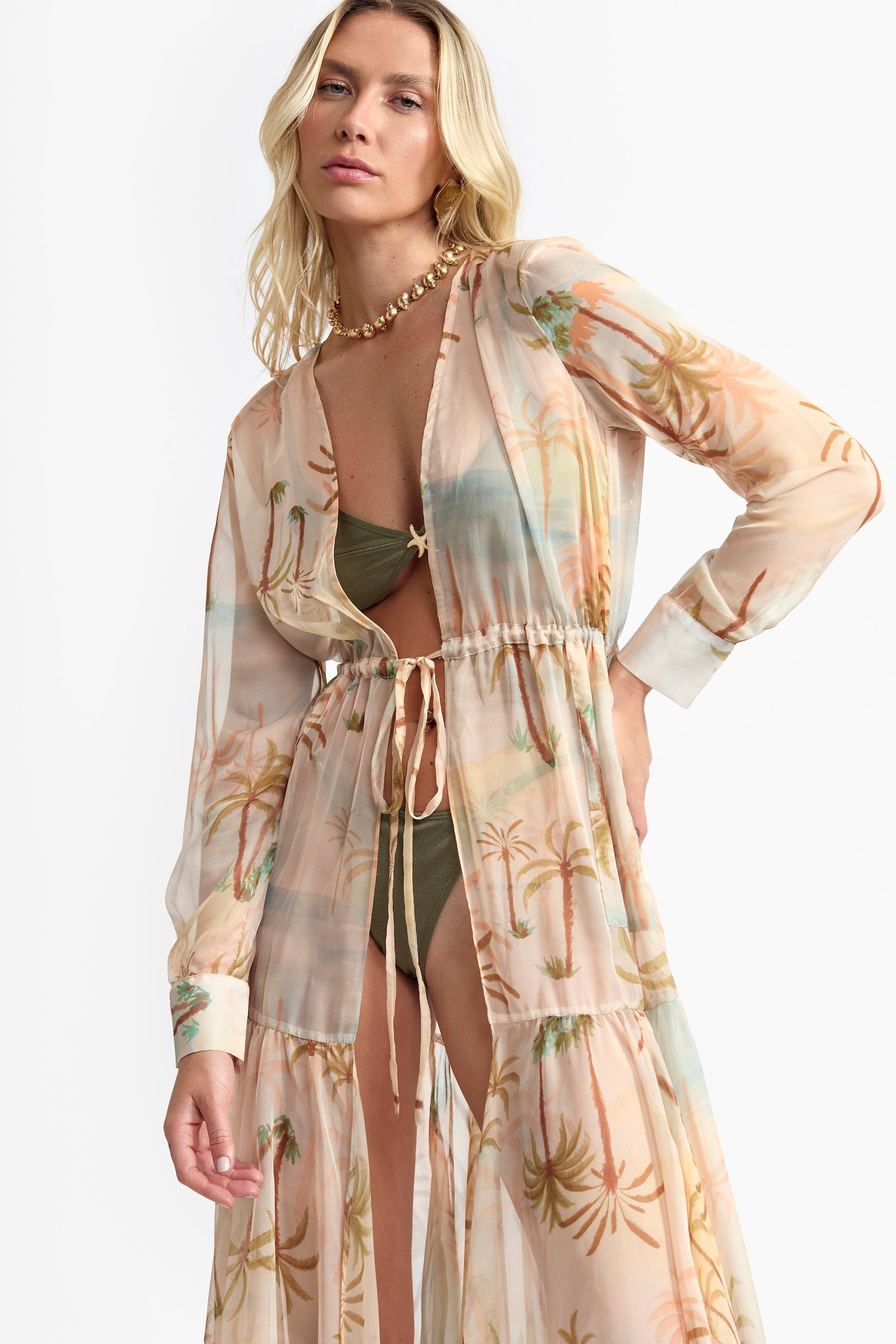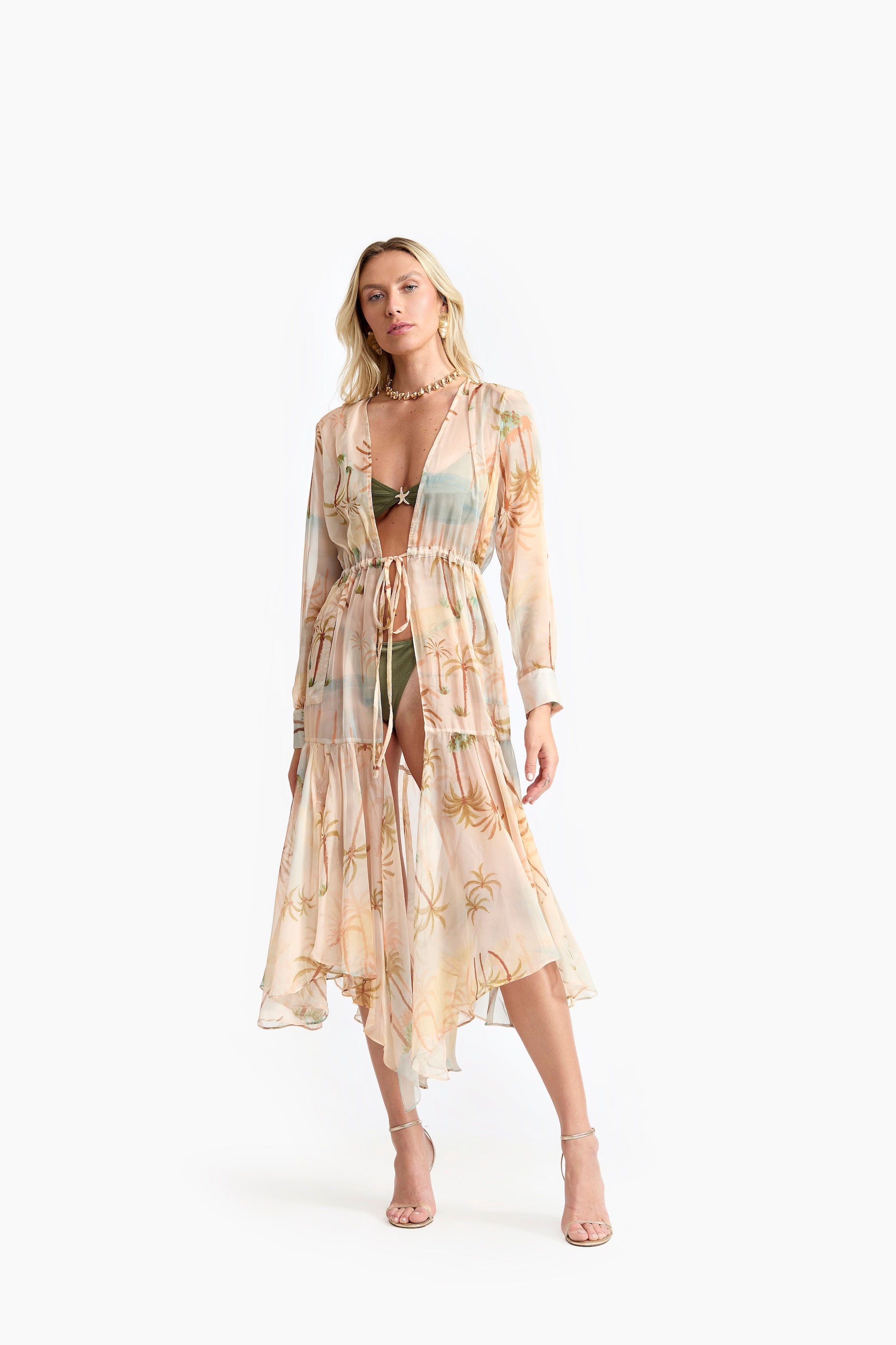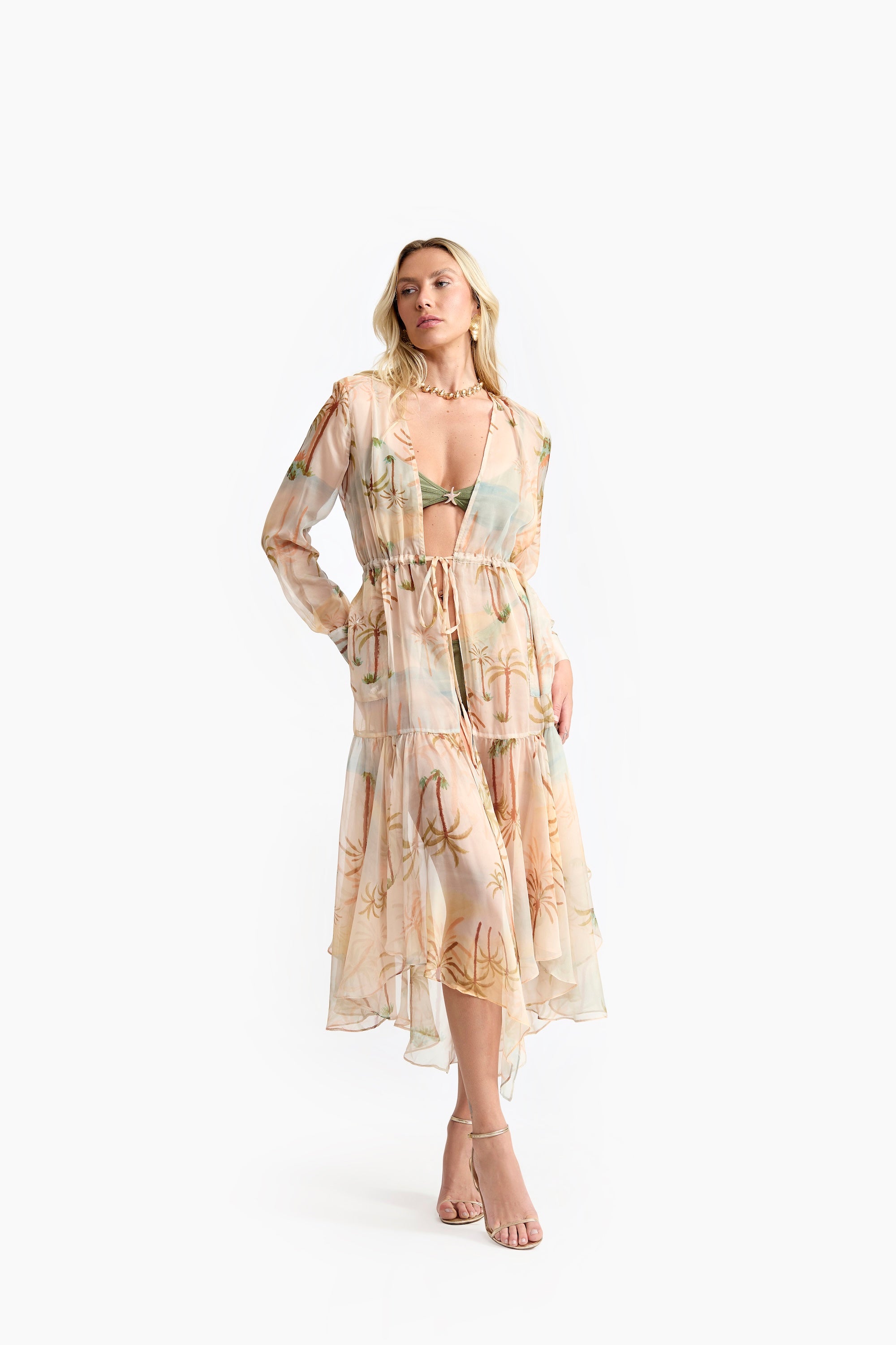 A Saída de Praia Maré traduz a essência dourada do entardecer à beira-mar — leve, fluida e naturalmente elegante. Feita em tecido estampado, com transparência sutil e estampa de coqueiros, evoca o brilho suave do pôr do sol refletido nas ondas.