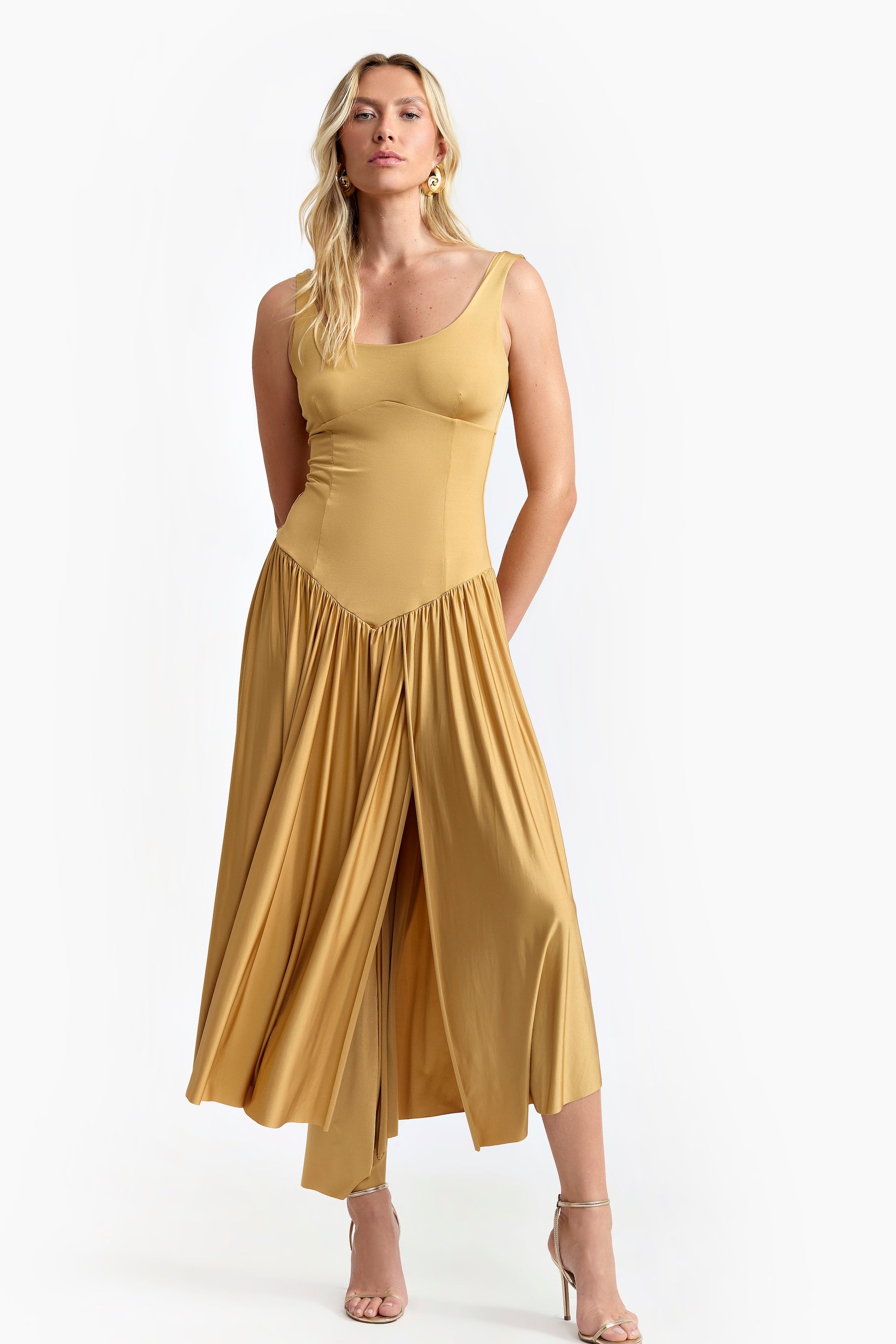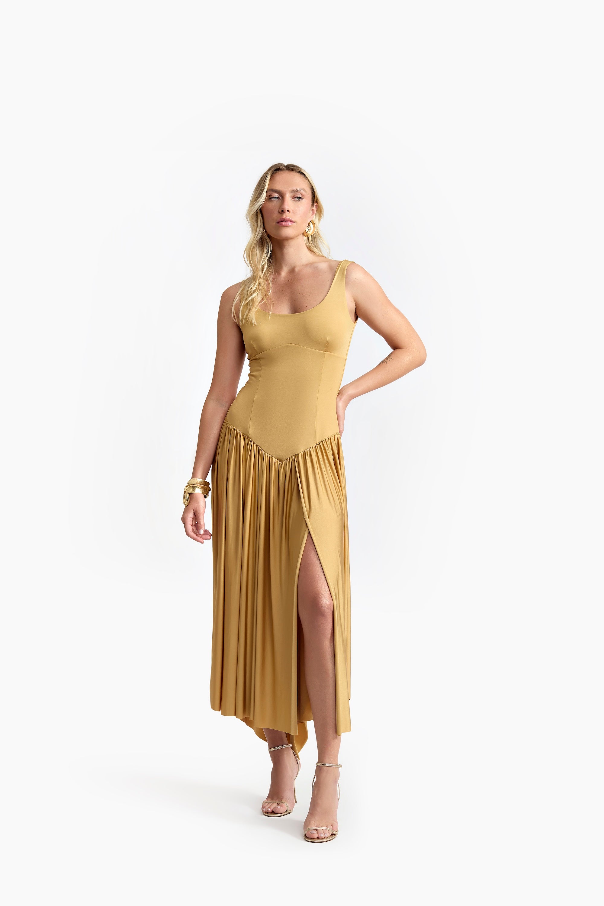 O Vestido Sunset celebra a sensualidade natural do entardecer, confeccionado em malha acetinada com toque leve e elástico, o modelo une conforto e elegância com um caimento fluido e sofisticado.
