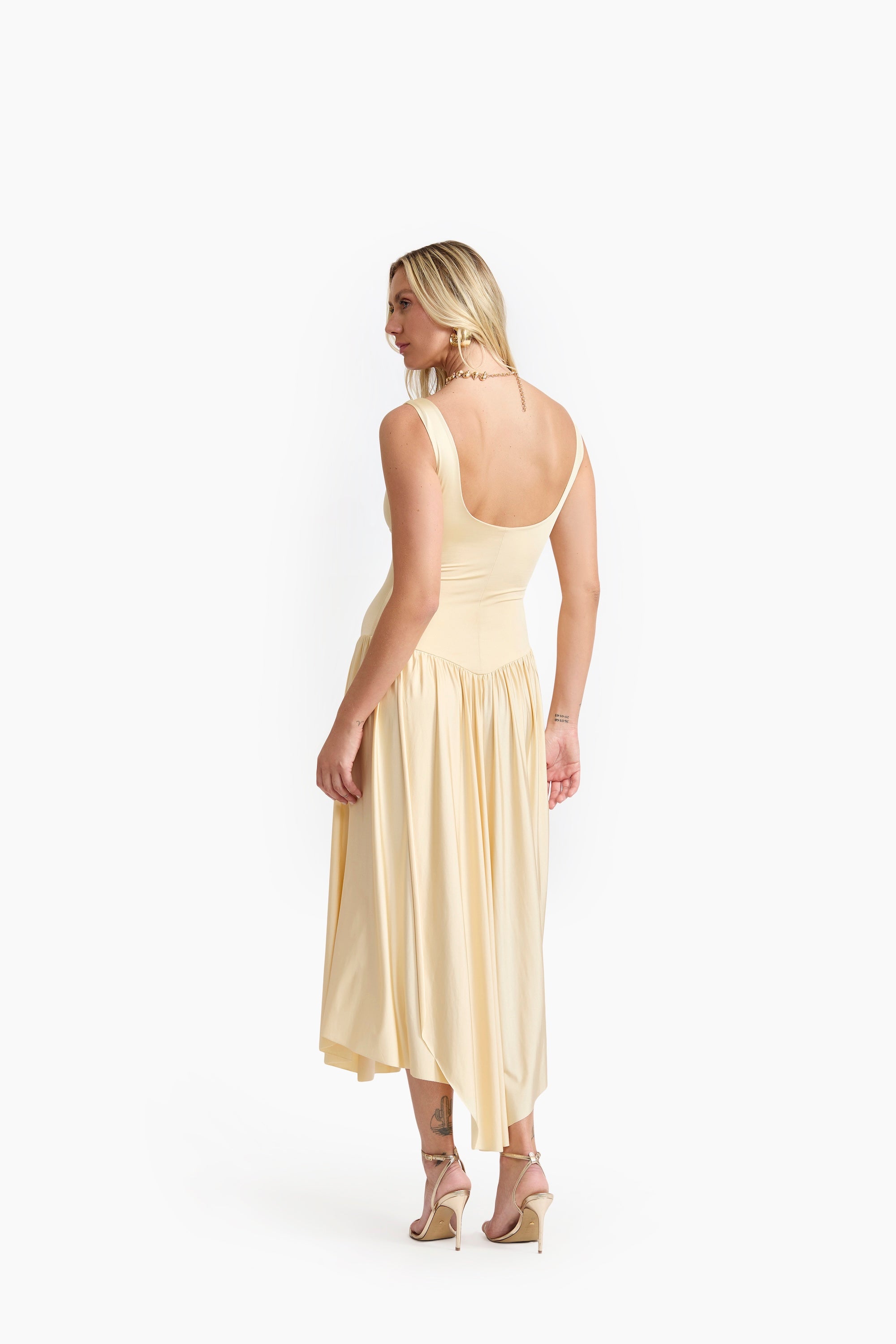 O Vestido Sunset celebra a sensualidade natural do entardecer, confeccionado em malha acetinada com toque leve e elástico, o modelo une conforto e elegância com um caimento fluido e sofisticado.